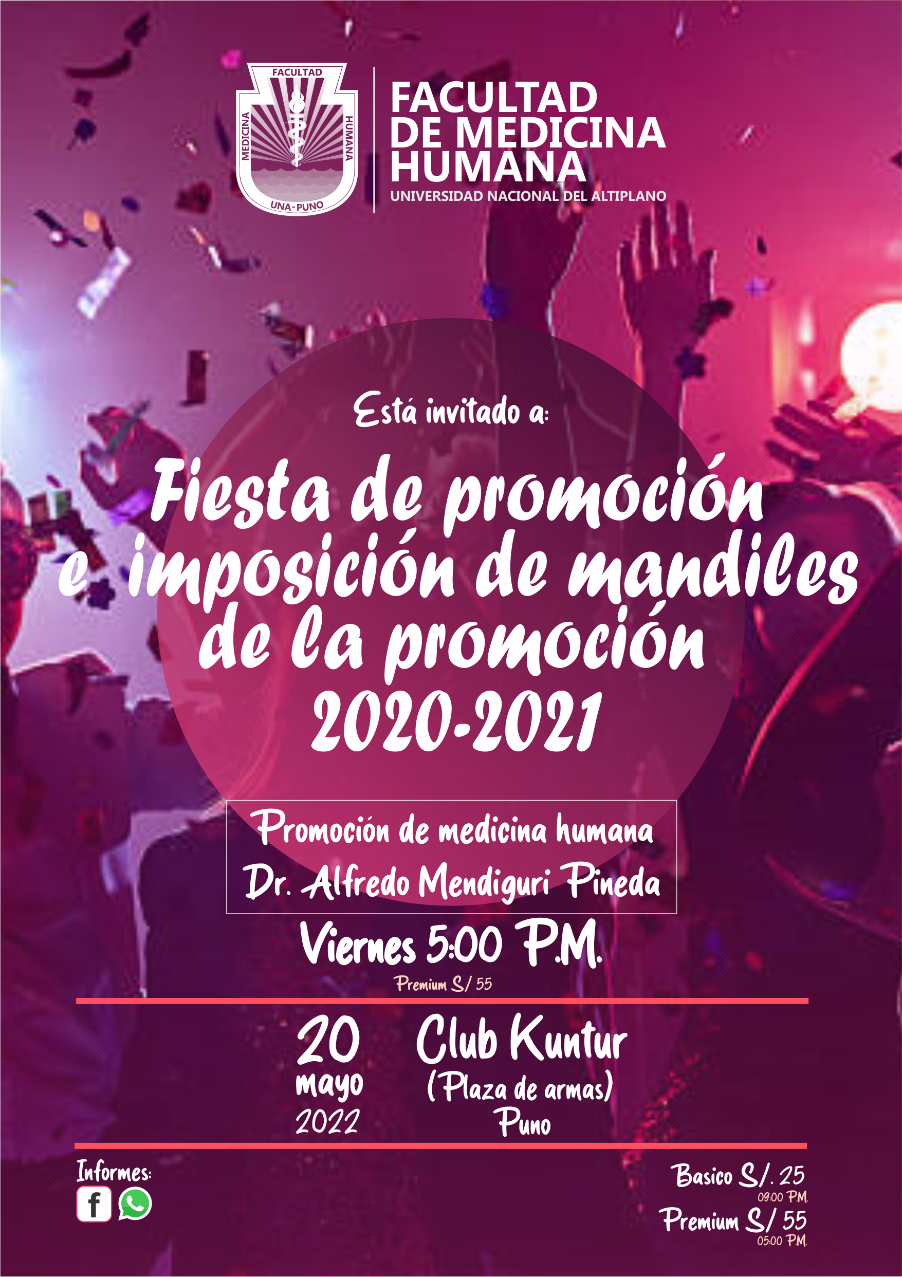La promoción de medicina humana "Dr. Alfredo Mendiguri Pineda", se honra en invitarlo a la fiesta de promoción e imposición de mandiles de la promoción 2020-2021. Se realizará en el Club Kuntur (en la plaza de Armas de la ciudad de Puno, lugar céntrico). El evento consta de entradas para su acceso: Premium (desde las 5pm [UTC-5]) y Básico (desde las 9pm[UTC-5], sólo para disfrutar la fiesta y la orquesta).